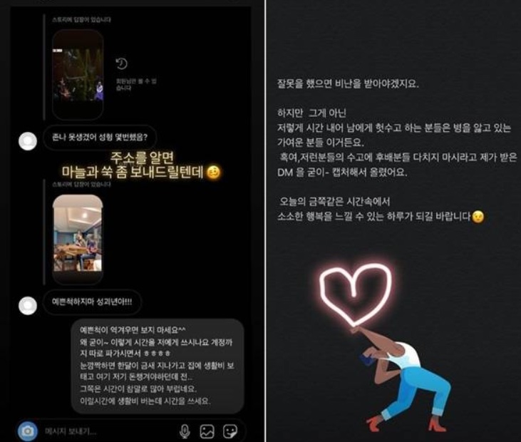 이후 옥주현은 또 다른 게시물을 통해 "잘못을 했으면 비난을 받아야겠다. 하지만 그게 아니라 시간 내어 남에게 헛수고하는 분들은 병을 앓고 있는 가여운 분들이다. 혹여나 저런 분들의 수고에 후배분들 다치지 마시라고 제가 받은 DM을 굳이 캡처해서 올렸다. 오늘의 금쪽같은 시간 속에서 소소한 행복을 느낄 수 있는 하루가 되기를 바란다"고 악플러에게 일침을 가한 이유를 밝혔네요!