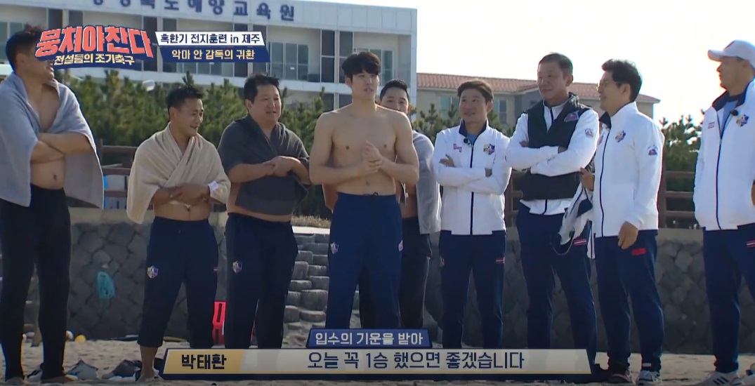 박태환은 망설임 없이 상의를 탈의, 완벽한 식스팩을 보여주면서 뭉찬에서 YB의 멋진 모습을 보여주었네요!!