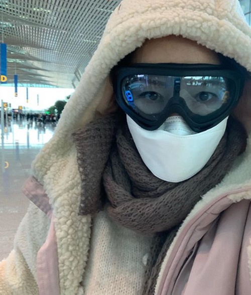 공개된 사진 속에는 마스크와 고글을 낀 채 공항 안 의자에 앉아 있는 미나의 완전무장한 모습을 보이고 있네요!